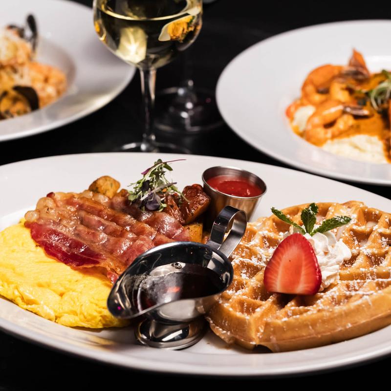 applewood bacon (3), scrambled eggs (2), shoestring fries & buttermilk waffle